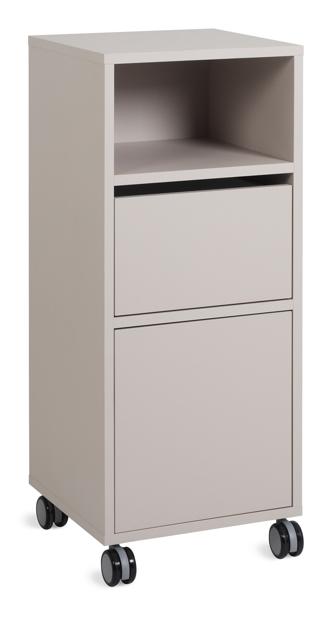 Carro de servicio para peluquería con ruedas. Color a elegir de la gama de imitaciones de madera del fabricante Pahi. El carro cuenta con un compartimento abierto en la parte superior. En la parte central, un cajón. En la parte inferior del carro encontrará una puerta giratoria con amplio espacio.