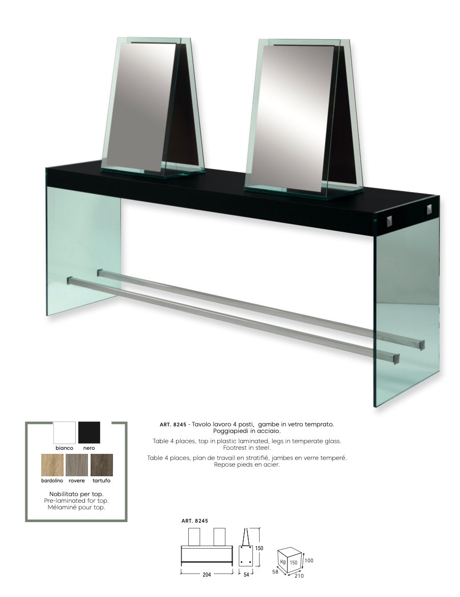 Ikon ist unser zentraler 4-Sitzer-Arbeitstisch mit Struktur aus gehärtetem Glas und Melamin-Arbeitsplatte. Die Glasbeine lockern die quadratischen und entschiedenen Linien auf, die die Struktur charakterisieren, und verleihen dem Tisch Schönheit und Eleganz. Praktisch und funktional, ist dieser Arbeitsplatz perfekt für einen Salon mit modernem und zeitgenössischem Design.